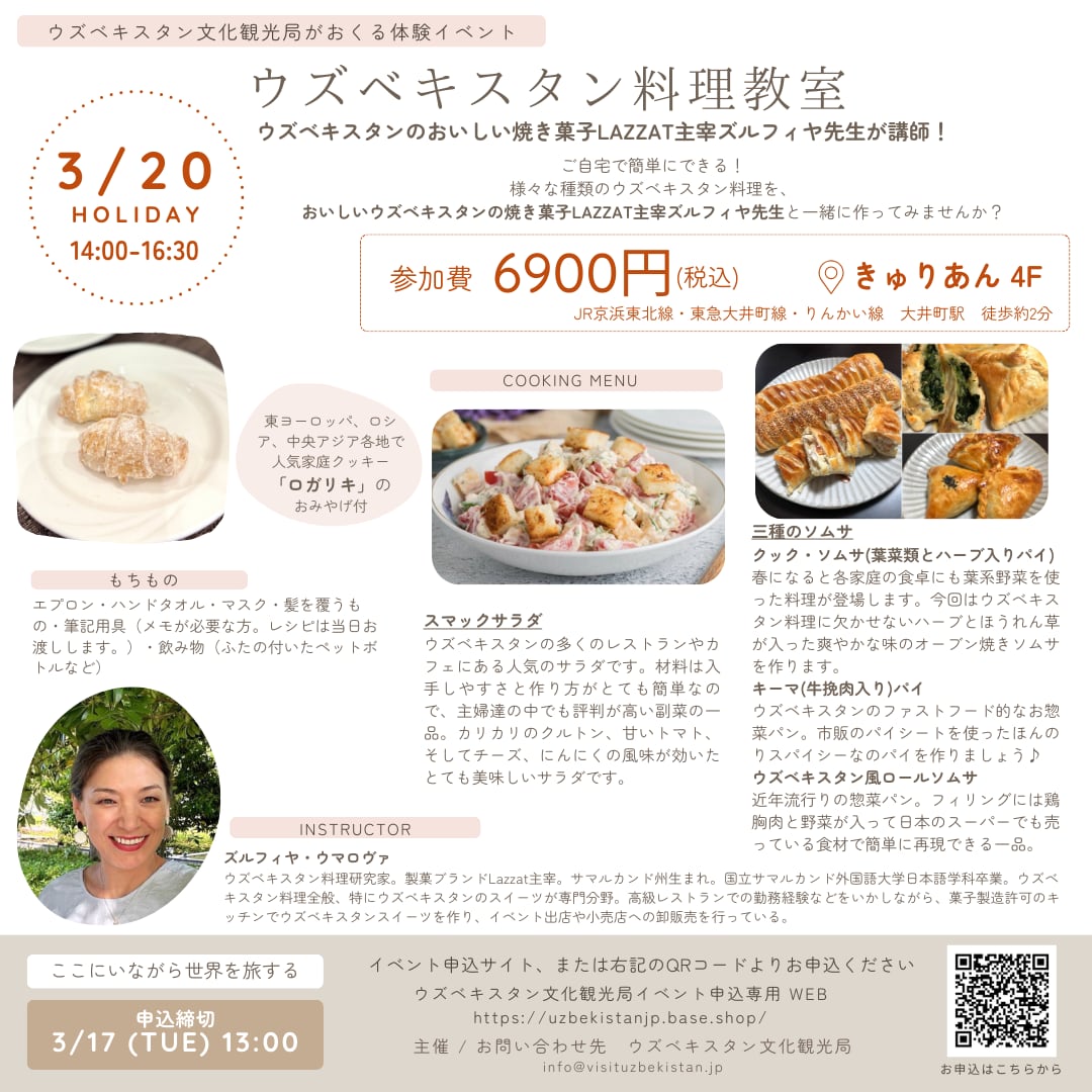 様々な種類のウズベキスタン料理を、おいしいウズベキスタンの焼き菓子LAZZAT主宰ズルフィヤ先生と一緒に作ってみませんか?